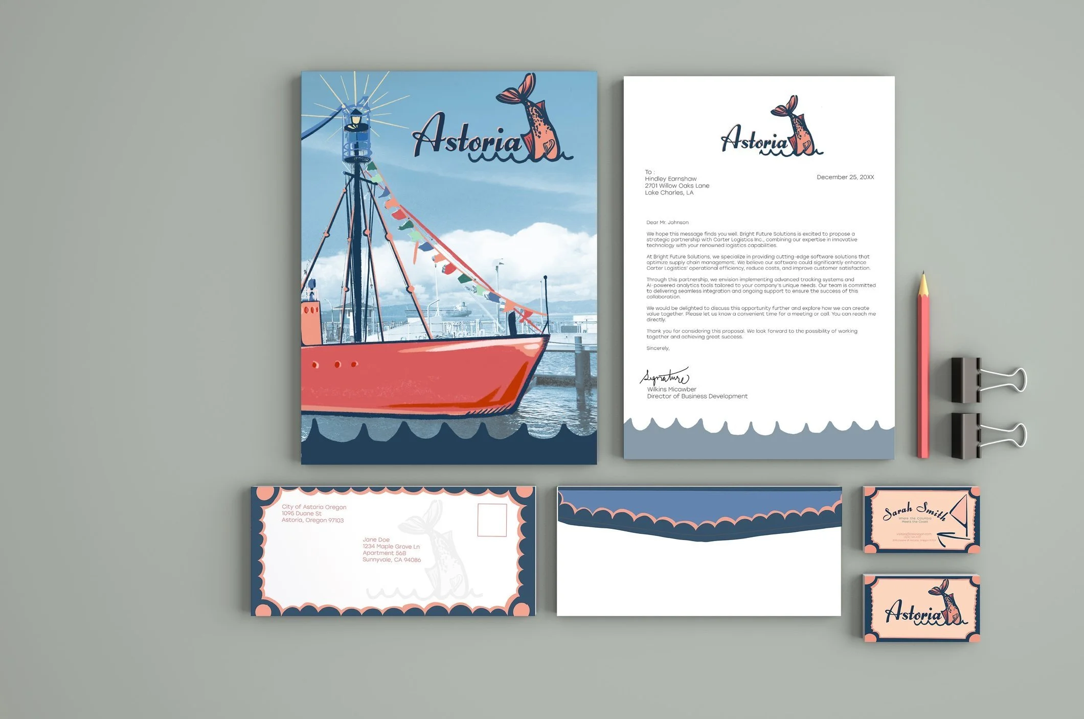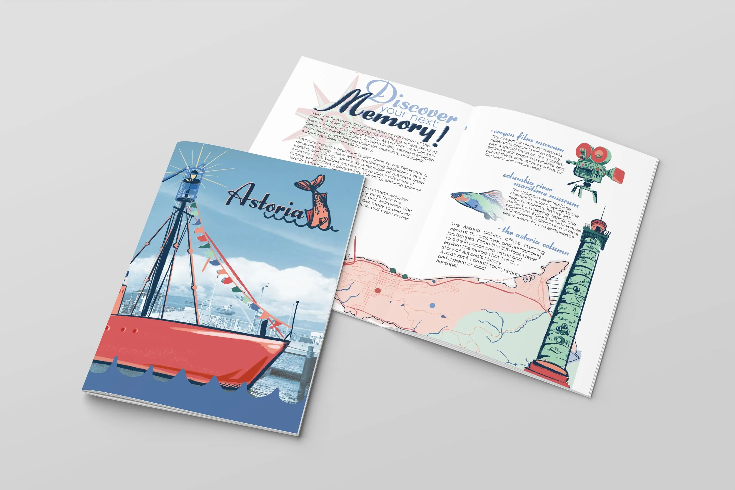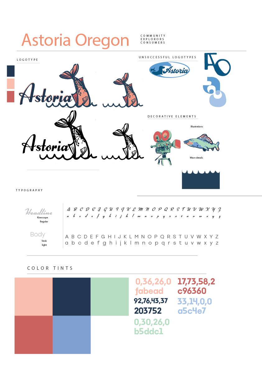 Redesigning the city brand of Astoria starts with researching its history, culture, and community values. Understand how the locals see their local identity and aesthetics. I I looked into the current branding to identify what feels welcoming and what seems dated. Develop a new visual identity, including a logo, color palette, and typography that reflect Astoria’s character and environment. I was inspired by traditional vintage coast designs, and strived to adapt them to illustrative language. I created a brand guide to ensure consistency. Creating a stationary set and a booklet that compliment each other but aren't a complete copy of one another.